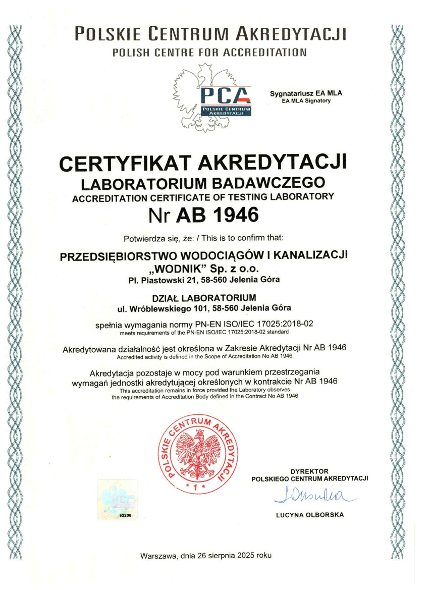 Laboratorium Spółki „WODNIK” przeszło pomyślnie proces akredytacji Polskiego Centrum Akredytacji. Otrzymany certyfikat jest formalnym potwierdzeniem kompetencji personelu oraz możliwości technicznych laboratorium do wykonywania badań zgodnie z najwyższymi standardami.