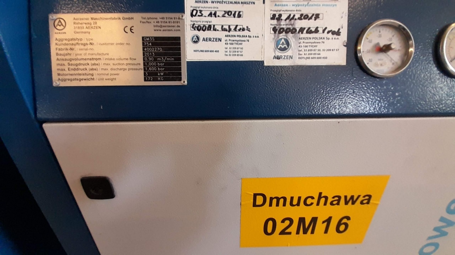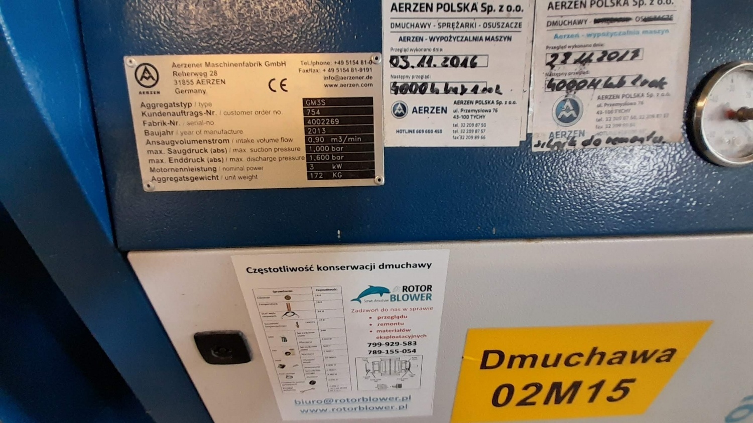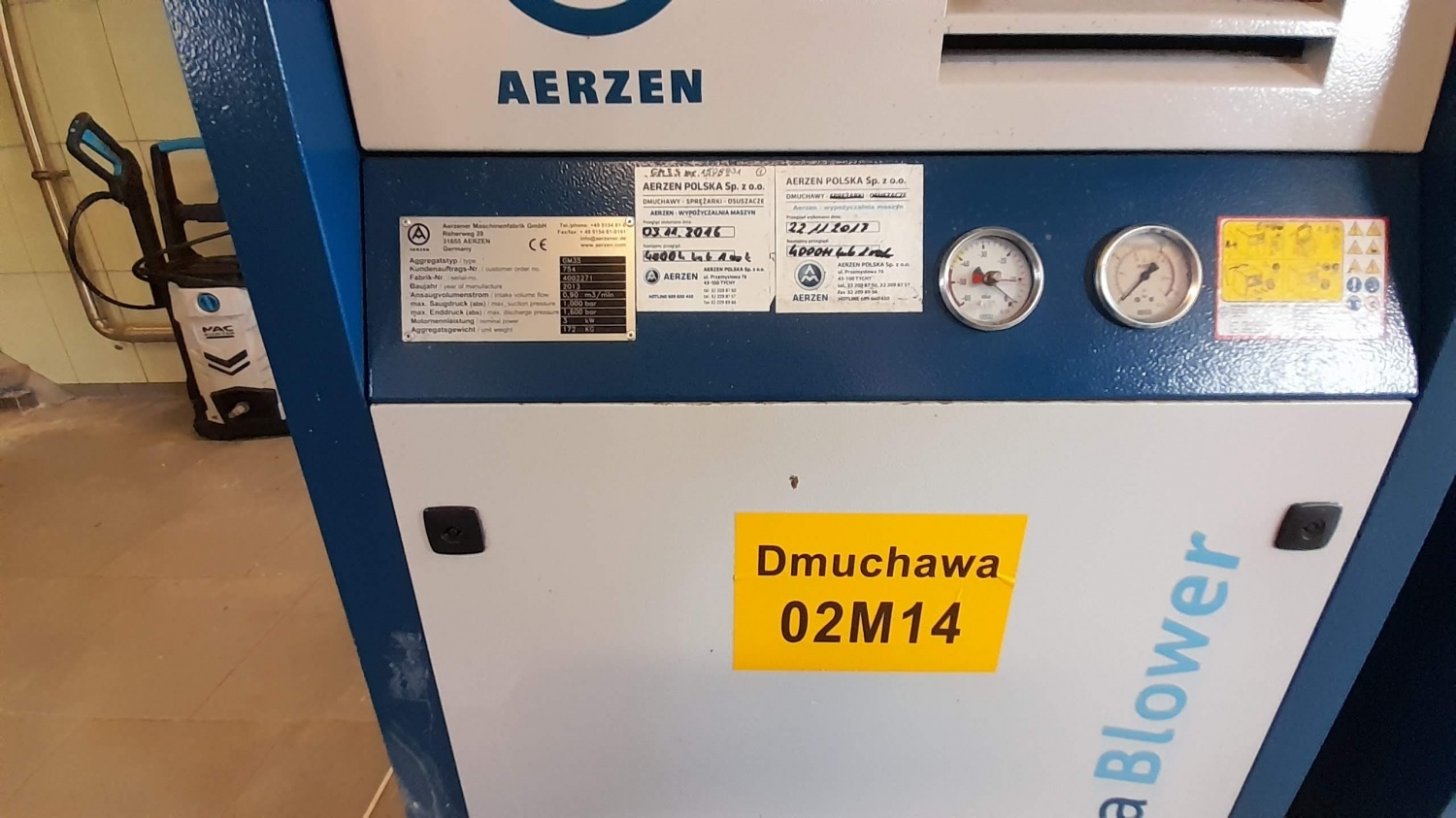 - Dmuchawa Aerzen GM 3s wraz z obudową, rok uruchomienia: październik 2014 r. nr seryjny: 1508930. Silnik WEG 3,0 kW