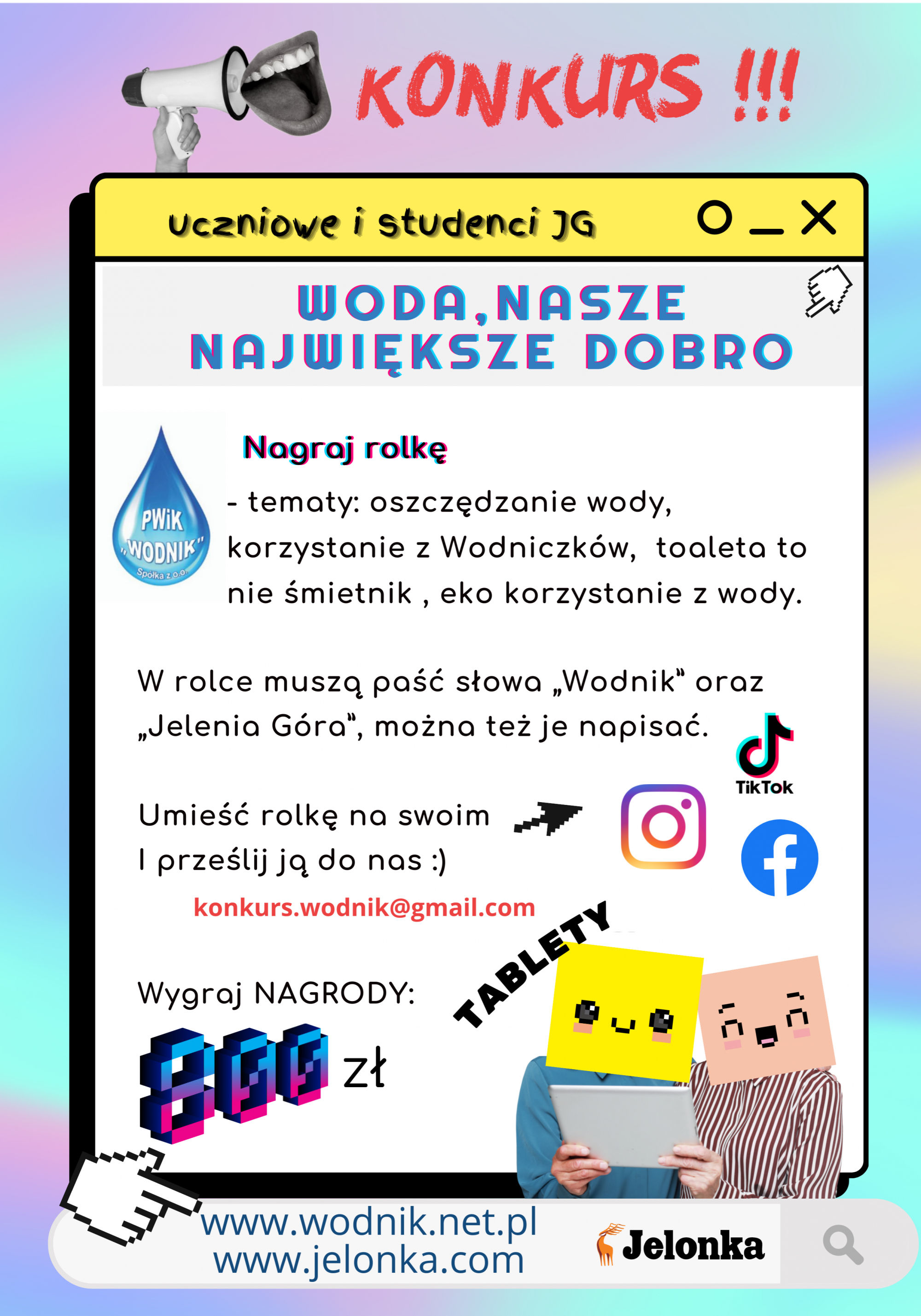 Przedsiębiorstwo Wodociągów i Kanalizacji „WODNIK” w Jeleniej Górze wspólnie z Portalem „Jelonka.com” organizują dla uczniów i studentów konkurs pt. „Woda, nasze największe Dobro”.